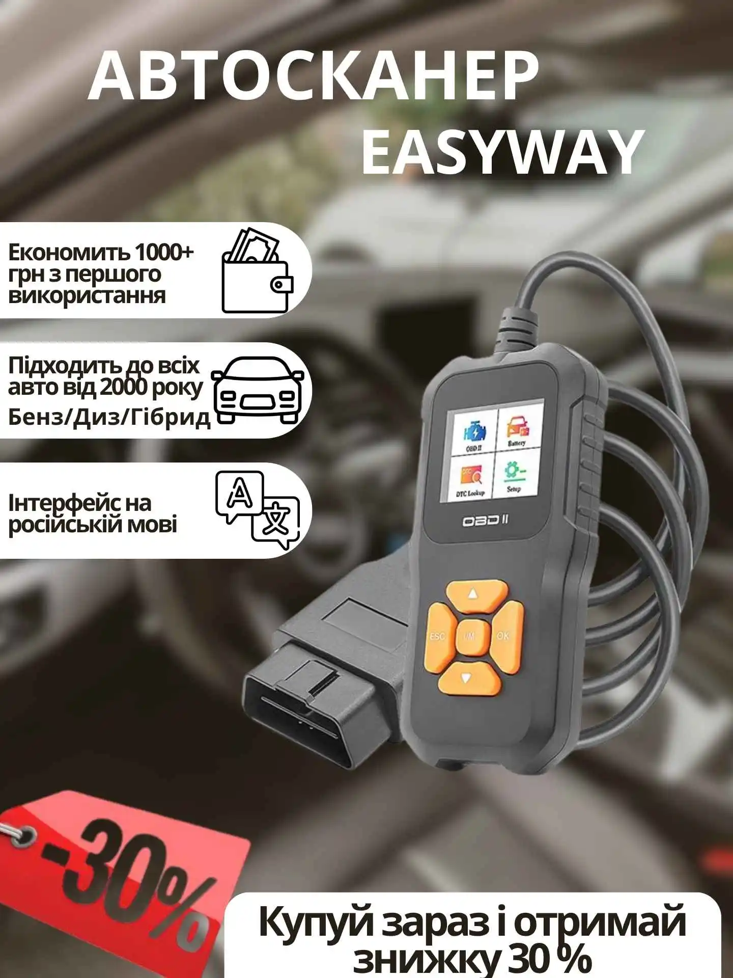 Діагностика без СТО заощаджуй час і грошіАвтосканер EasyWay — це твій персональний майстер, який допомагає заощадити на кожному візиті в СТО. Просто підключи його у роз’єм OBD2, і вже через кілька хвилин побачиш точну причину Check Engine або будь-якої іншої несправності. Не потрібно телефонів, програм чи інтернету — все відображається прямо на екрані. EasyWay дозволяє самостійно скинути помилки, контролювати стан двигуна і зекономити сотні гривень уже після першого використання.